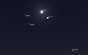 The Moon passes 4° north of Jupiter at 9 P.M. EST. The pair shares the central regions of Gemini this evening, with the Moon appearing to the upper left of Jupiter, and framed on the left by the Twins’ bright stars Castor and Pollux.