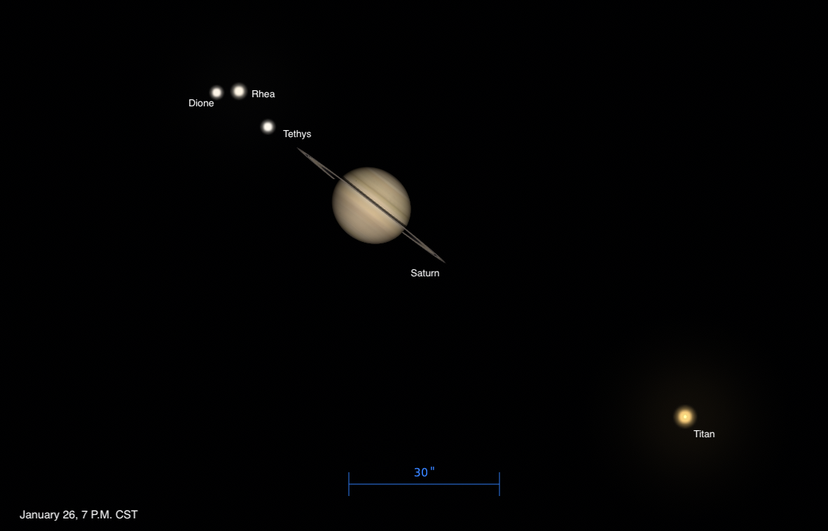 Saturn’s moons line up — and jockey for position — the evening of January 26. Moons fainter than 11th magnitude are not shown. / Stellarium/Oleg PlutonMonday, January 26
