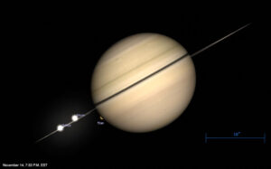By just after 7:30 P.M. EST, Titan is beginning to peek out from behind Saturn’s southeastern limb. It will take several minutes for the large moon to fully emerge from behind the planet. Credit: Oleg PlutonFriday, November 14