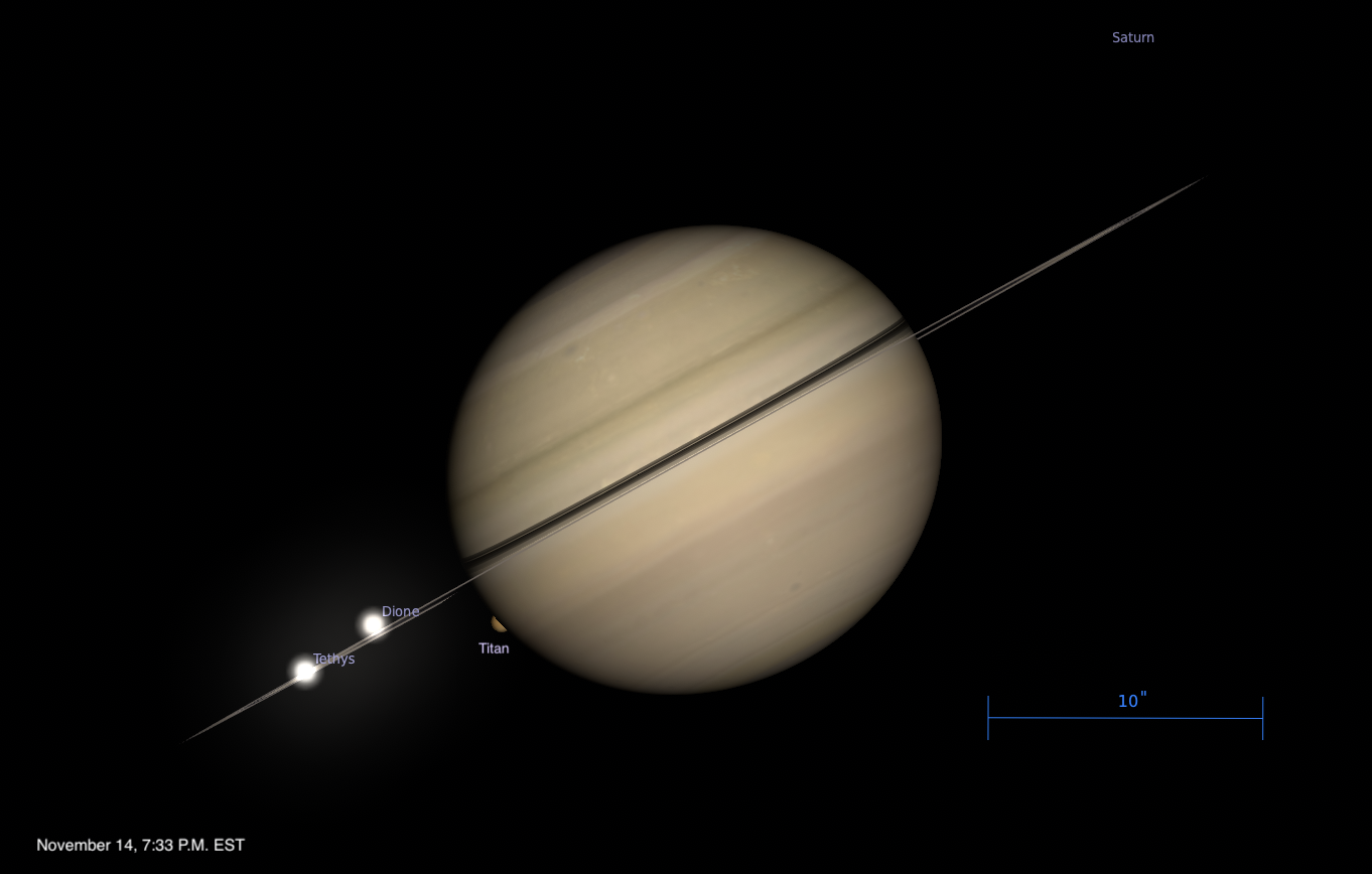 Titan begins to appear at 7:26 P.M. EST, taking several minutes to make its way into view. Also visible to Saturn’s east before Titan begins to emerge are 10th-magnitude Dione and Tethys; the former is closer to the planet. Both are close to the rings and begin transits shortly after Titan emerges, although they will be too faint to see by eye against the brightness of Saturn’s disk. Experienced imagers using high-speed video cameras may catch them. Tenth-magnitude Rhea is far to Saturn’s east; see if you can spot this moon as well.